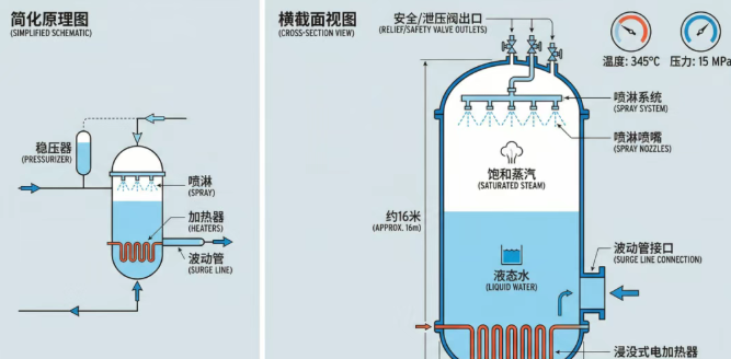 稳压器运作的核心,在于维持内部饱和水与饱和蒸汽的两相平衡。通过波动管与一回路相连,它实时感知系统压力变化: